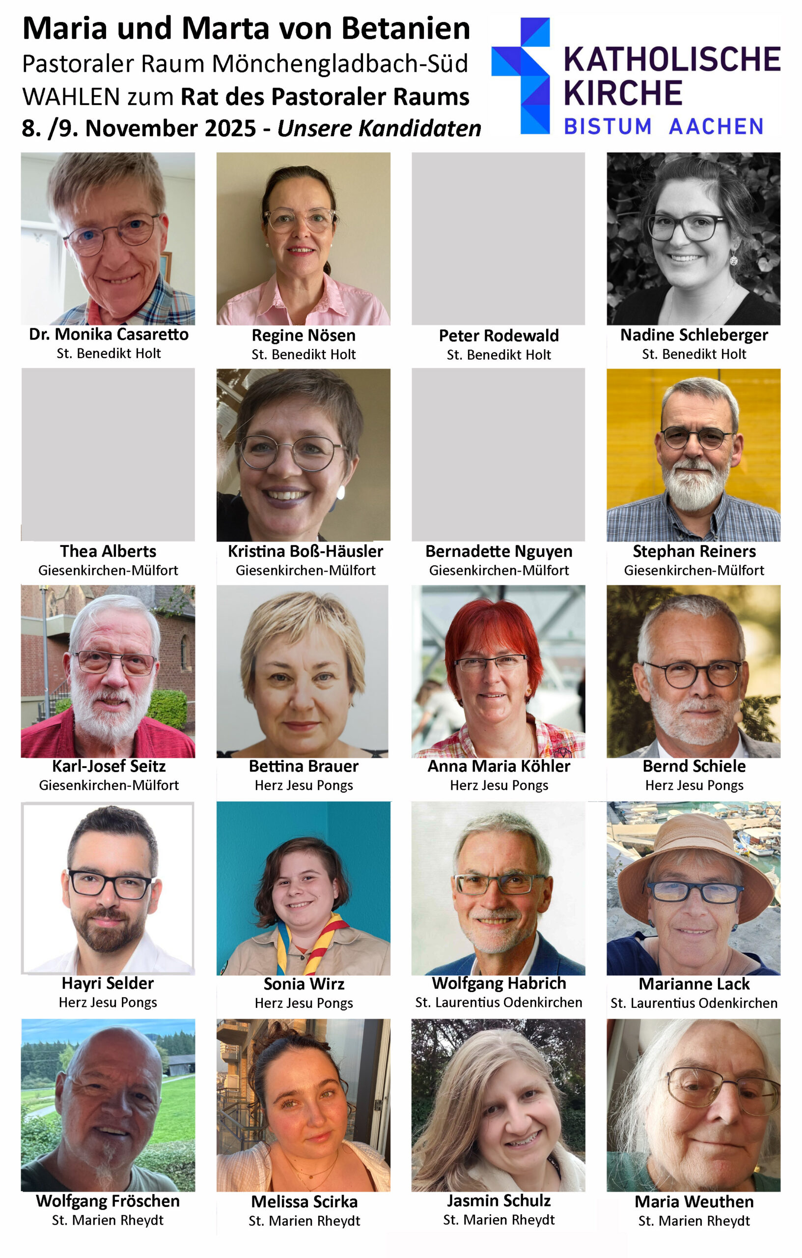 Die Wahlen finden in fünf Wahl-bezirken statt, der Bereich unserer ehemaligen GdG Giesenkirchen-Mülfort ist einer dieser Wahlbezirke. Die anderenWahlbezirke sind